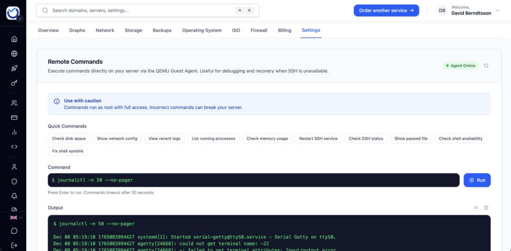 At HostUp, we believe you should have complete control over your server—even when things go wrong. That’s why we’ve introduced Remote Commands in our customer portal. It’s a powerful tool that lets you run commands directly on your server through the QEMU Guest Agent—no SSH login required.