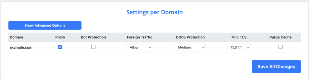 Controls whether your website’s traffic is routed through Cloudflare. We recommend keeping this enabled. With this option you get a basic WAF that protects your site against known vulnerabilities, DDoS protection, and a CDN that speeds up your site for global traffic.