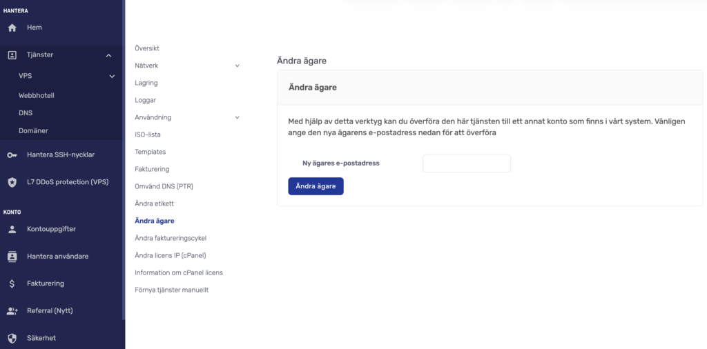 - Enter the recipient’s email address: Fill in the email address of the other account in our system and click the “Change Owner” button.