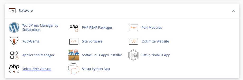 - Väl inne i cPanel, bläddra ner till sektionen Programvara (Software) och klicka på Select PHP Version. Se bild ovan.