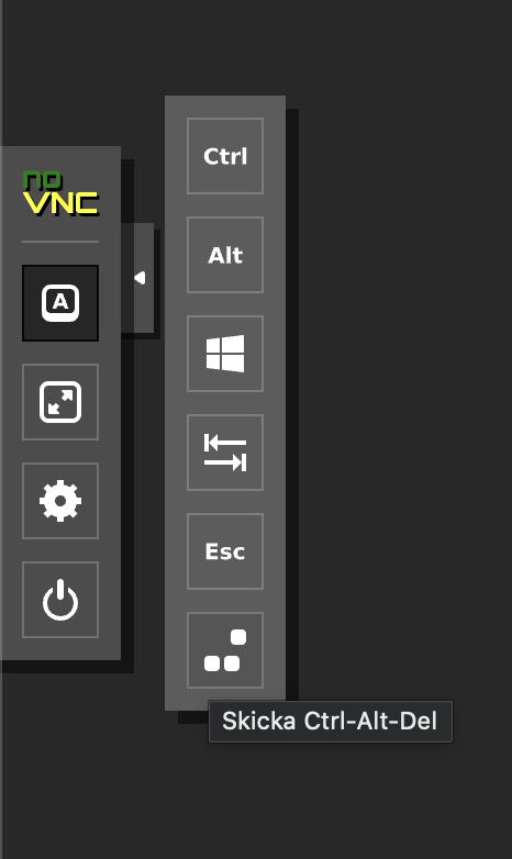 Kontakta supporten om du inte kan nå servern ens via VNC-konsolen i kundzonen. I Konsolen för att skicka ctrl + alt + del klicka på pilen till vänster sida och leta fram kommandot. Du ska inte trycka på ctrl + alt + del på din dator när du ansluter via konsolen.