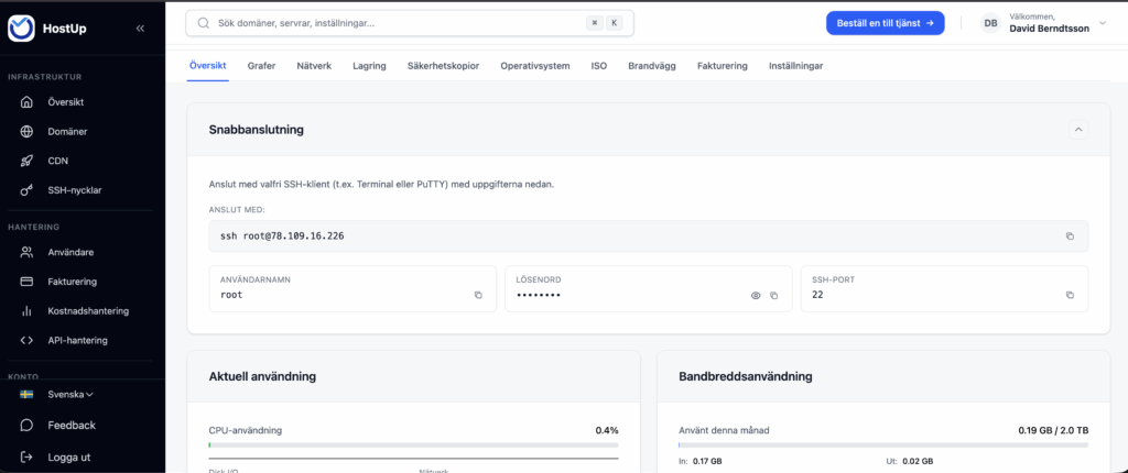 - IP-adress och lösenord: Klicka på din tjänst i kundzonen för att se serverns IP-adress. Här hittar du också användarnamn & lösenord.