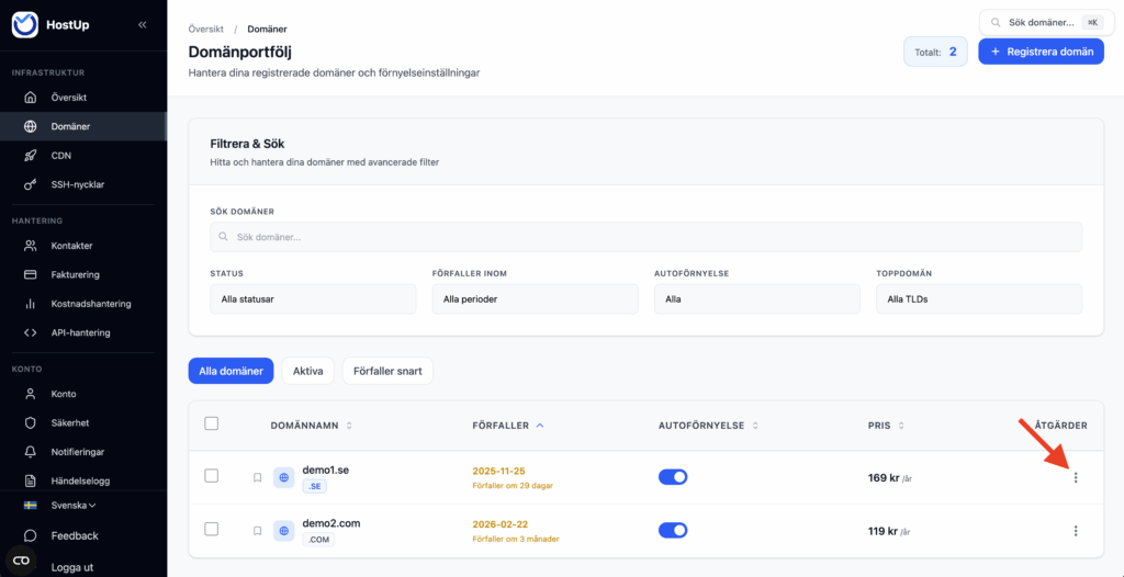 - Begär avregistrering: Klicka på : menyn som pilen i bilden nedan markerar. Välj sedan ”Ta bort domän”. En bekräftelseruta kommer att visas, klicka på ”Ta bort domän”.