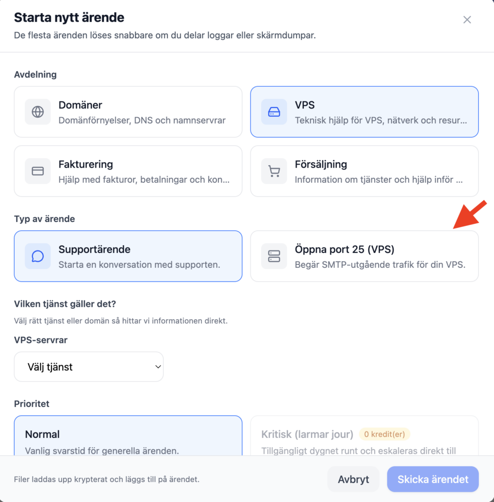 CMD + K(Mac) /CTRL + K(Windows) och sök efter ”Support”. - Klicka på ”Skapa ärende” och välj ”Öppna port 25 (VPS)