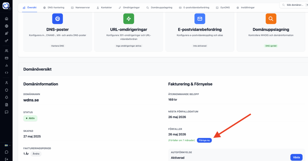 - Automatisk dragning: Om du har lagt till ett betalkort till ditt konto kommer vi att debitera dig på förfallodagen kl 20:00 och din domän kommer att förnyas automatiskt.