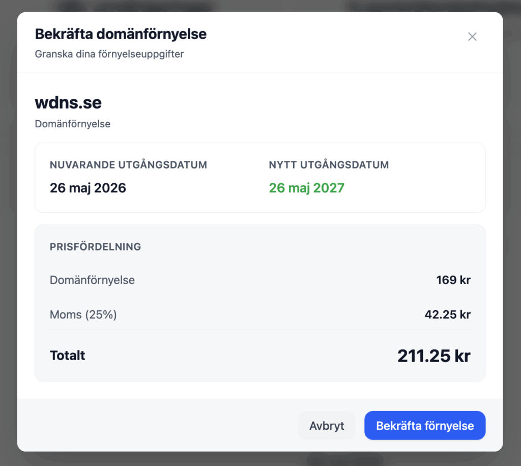 - Klicka på ”Bekräfta förnyelse”: En ny faktura för förnyelse kommer nu att skapas. Så fort den är betalad kommer din domän att förnyas.