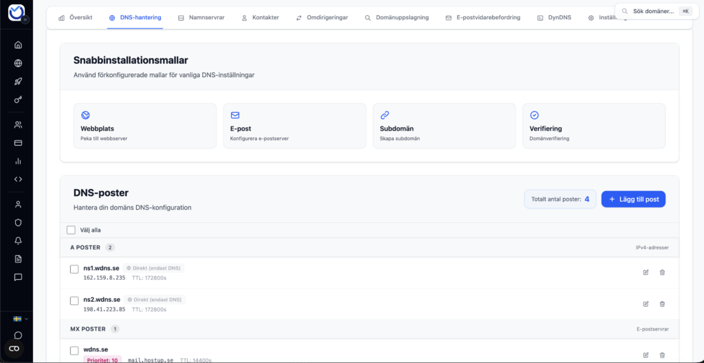 - Högst upp på sidan kan du välja vilken slags DNS post du vill lägga till (se bilden ovan). Du kan antingen använda ”Snabbmallarna” eller klicka på ”Lägg till post” knappen.