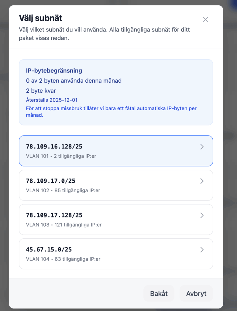 Om du för någon anledning vill byta IPv4 på din nuvarande VPS är detta också enkelt. Klicka på knappen ”Byt” IPv4 som den första bilden visade. Sen kan du välja ett nät du vill få en IP inom.