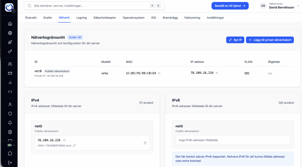 Att lägga till IP adresser är enkelt. Tryck på ”Tilldela ny IP-adress” knappen för att lägga till en IP från din tillgängliga pool. Observera att för IPv4 så ingår endast en IP som standard. Du kan enkelt köpa till mer IPv4 genom att köpa till det som tillägg. Extra IPv4 kostar 20 kr/mån.