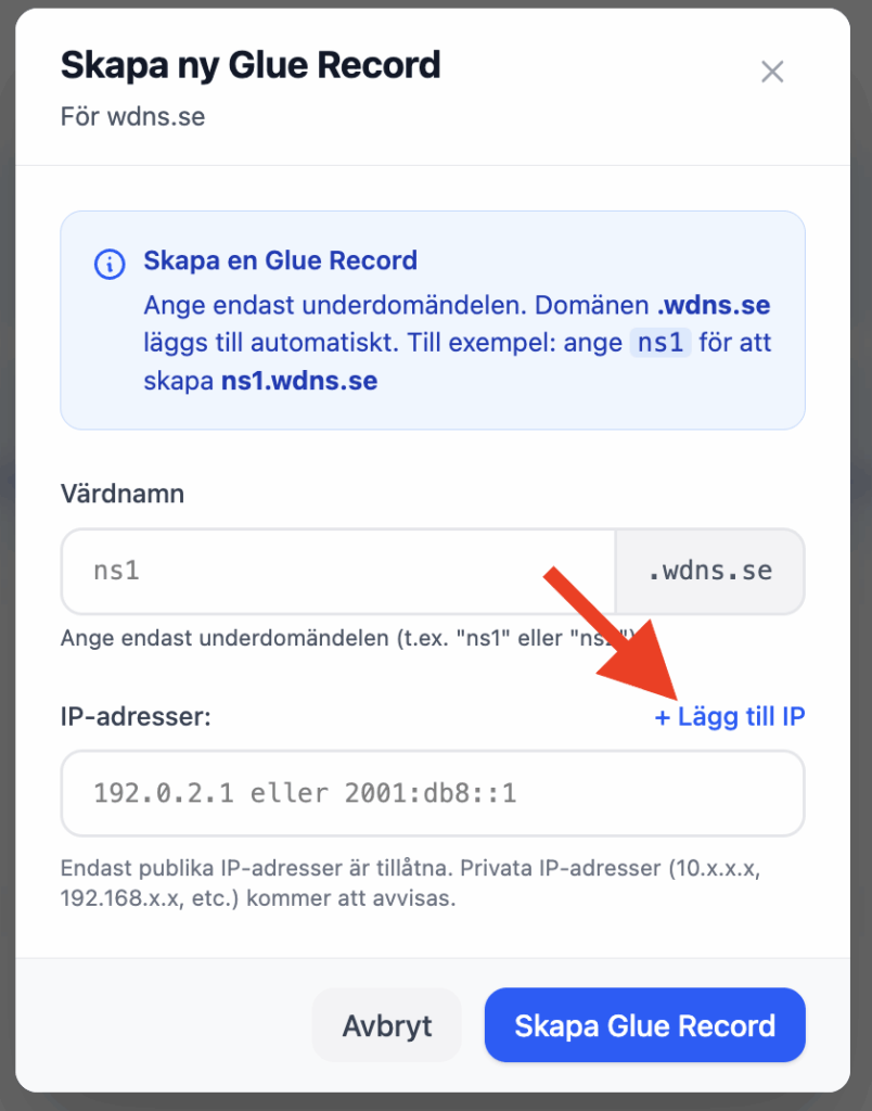 - IPv4 & IPv6: Om du vill registrera en namnserver med både IPv4 och IPv6, klicka på ”Lägg till IP” enligt bilden nedan: