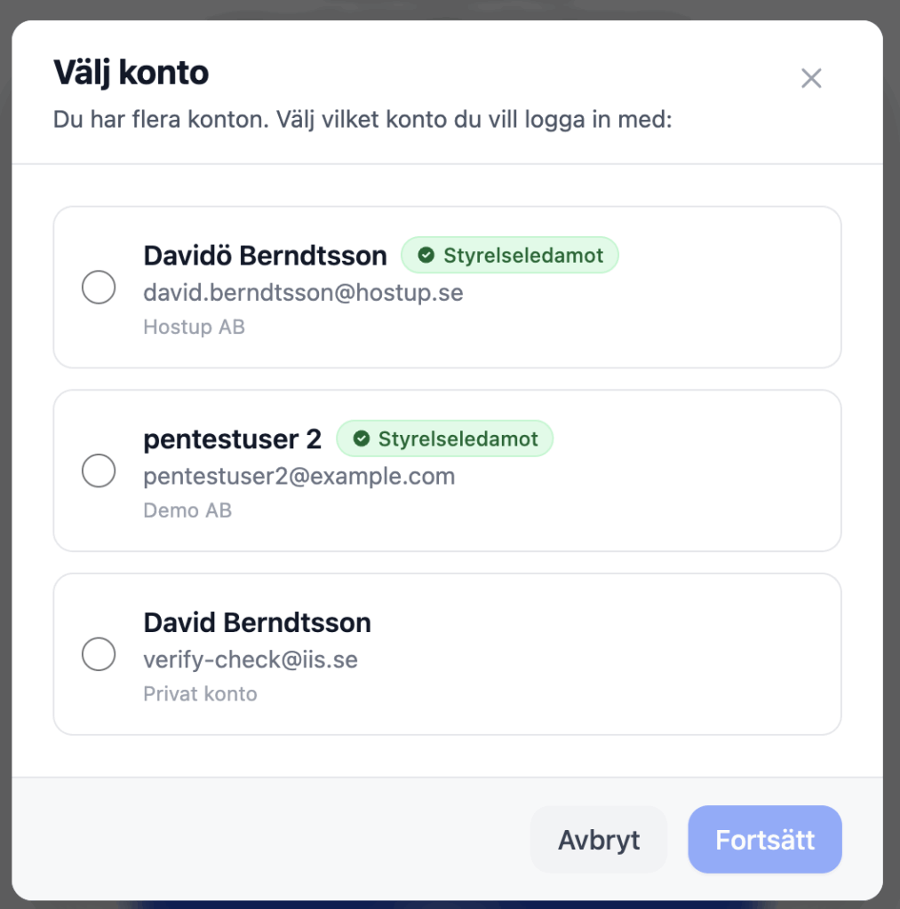 En till funktion som kan vara bra att känna till. Om du har flera företagskonton hos oss eller om du har ett företagskonto och ett som privatperson kommer du att få en ruta när du loggar in med BankID där du enkelt kan välja vilket konto du vill logga in till.