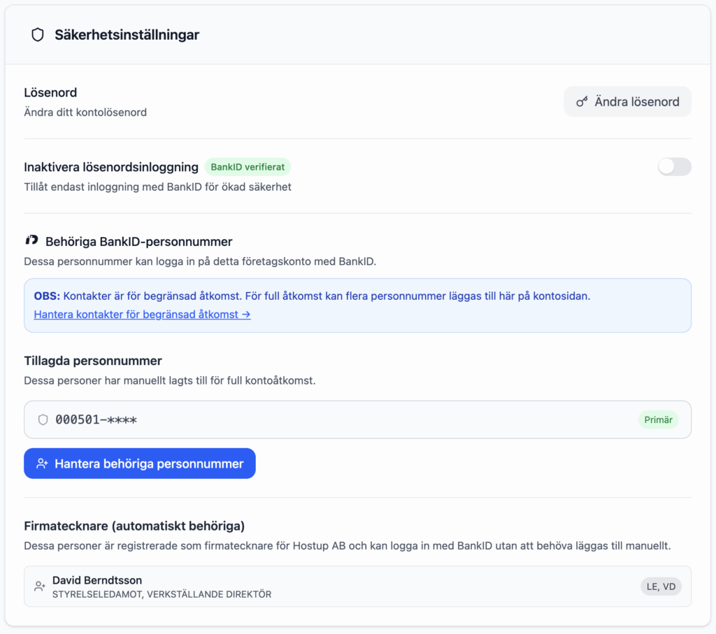 Företag som använder HostUps tjänster har möjlighet att låta en eller flera andra personer logga in på företagets konto med hjälp av BankID. För att göra detta, navigerar du till kontoinställningar på https://cloud.hostup.se/account