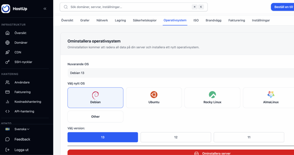 Observera att all data på din VPS kommer att tas bort när du installerar om den. Se därför till att du har tagit säkerhetskopia på eventuellt viktiga filer!