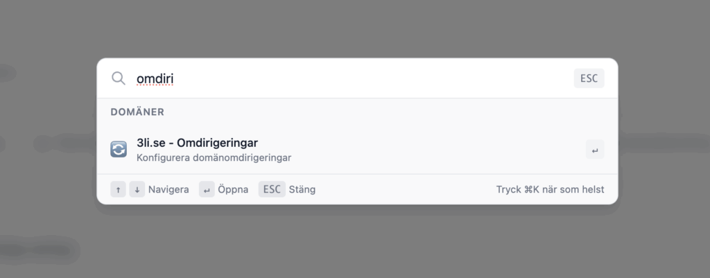 🔍 Snabbsök (rekommenderat): Tryck ⌘K (Mac) eller Ctrl+K (Windows) och sök efter ”omdirigering”. Välj din domän.