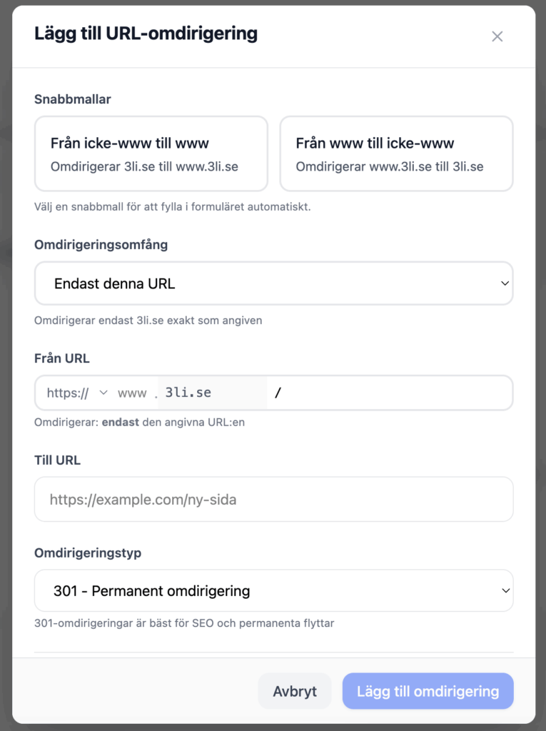 När du klickar på ”Lägg till omdirigering” öppnas ett formulär med följande alternativ: