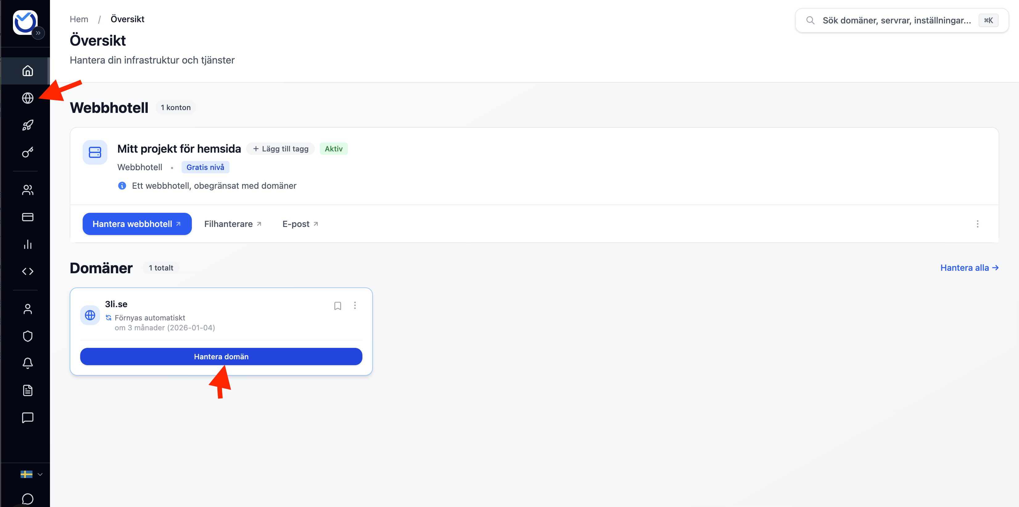 Via översikten: Klicka på ”Hantera domän” knappen direkt från översikten.