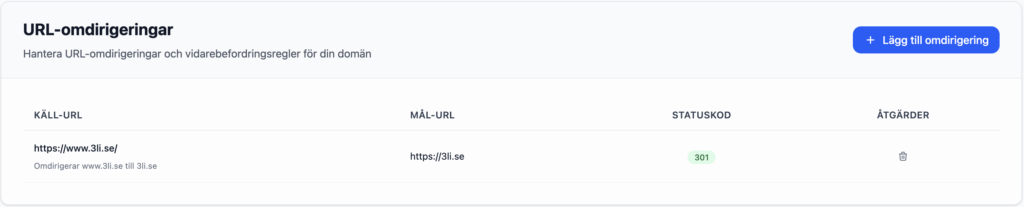 Du kommer i vyn kunna se din omdirigering och den kommer fungera inom 1 minut.