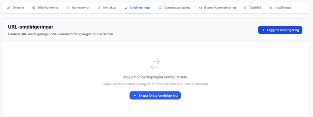 På tabben ”Omdirigeringar” klicka på ”Lägg till omdirigering”