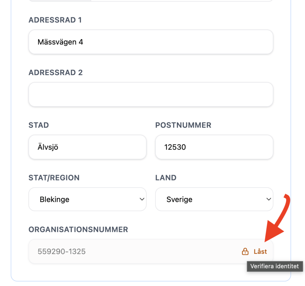 Du kan redigera alla fält förutom organisationsnummer / personnummer fältet. För företag behöver du identifiera dig med BankID och vara behörig firmatecknare. Vi kollar upp uppgifterna via bolagsverket. Om det är flera som är behöriga och de inte har möjlighet att teckna för firman var för sig, behöver samtliga identifiera sig.