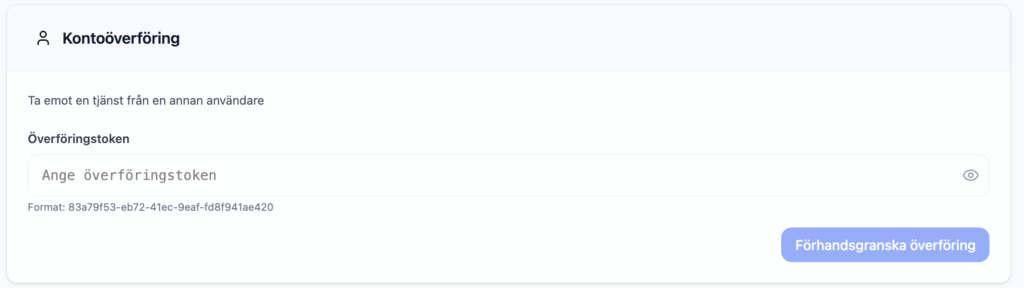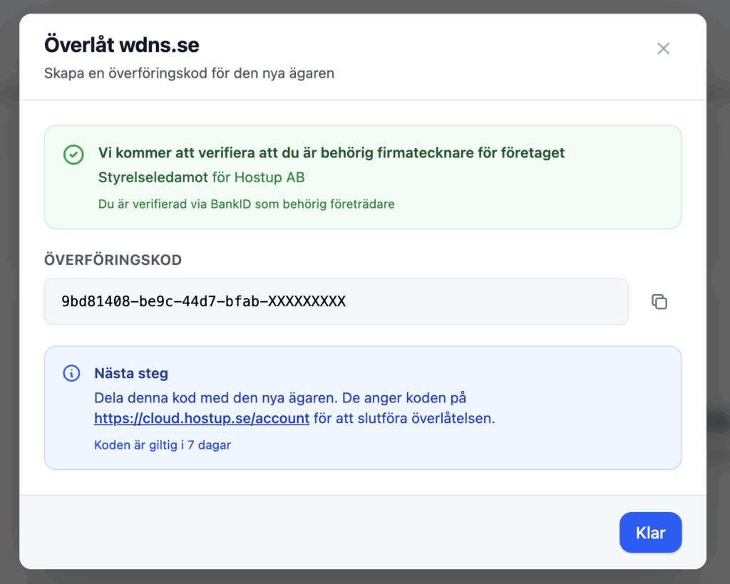 Den nya ägaren behöver navigera till https://cloud.hostup.se/account och skriva in överföringskoden. För .se och .nu domäner behöver de också acceptera Internetstiftelsens användarvilkor innan överföringen slutförs.