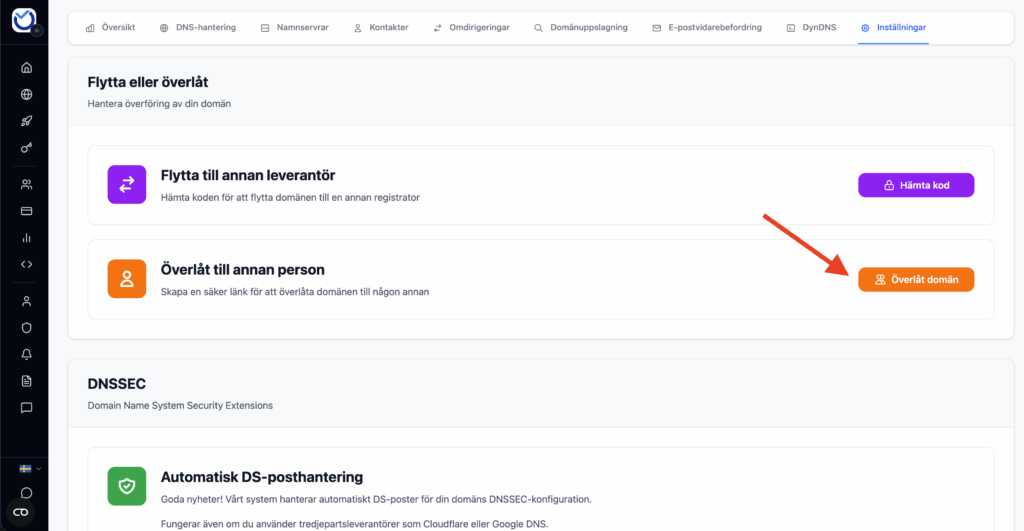 - Navigera rätt: När du är inloggad navigera till Inställningar för domänen. Klicka sedan på ”Överlåt domän”: