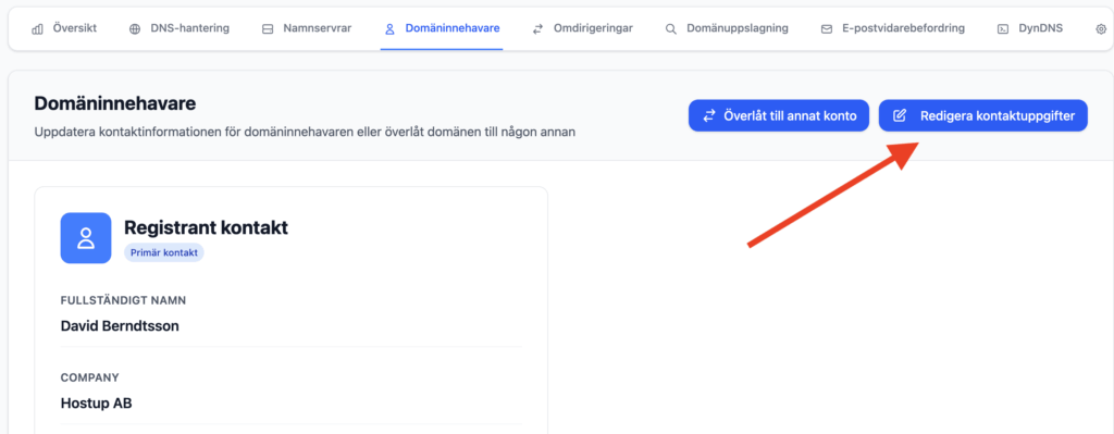 Navigera till Domäninnehavare-fliken som bilden nedan visar och klicka på ”Redigera kontaktuppgifter”