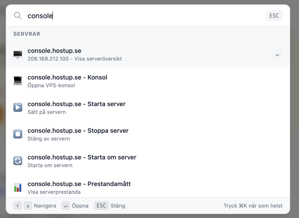 - ”console” – Öppna VNC-konsol för dina VPS:er