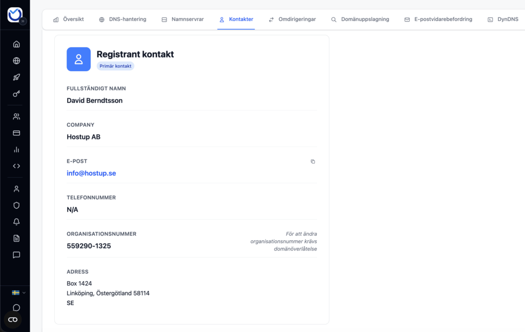 Viktigt: Det är ditt ansvar att se till att dina kontaktuppgifter alltid är aktuella. Om vi inte kan nå dig med viktig information på grund av inaktuella uppgifter, kan det påverka statusen för ditt domännamn.